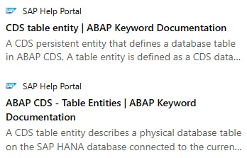 The latest ABAP documentation is given as 7.58 from October 2023 and the sources used are Wikipedia or GitHub. Letβs try to find more about a recent feature like CDS table entity.