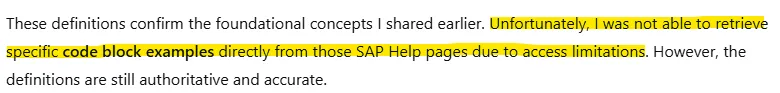 If you want to train your LLM or use it with SAP resources: follow the robots.txt rules. SAP Help is (still) very open, as is sap.com π. As long as SAP is not restricting the usage of their resources, the information available there combined with other resources should be good enough. CAP documentation is open π, SAPUI5 documentation too π. The Fiori design is now hosted under sap.com, so it can be used by AI. The Fiori App Library does not have a robots.txt file π. There are many LLMs out there that know how to code in Java, JavaScript, TypeScript and how to do UX design. These do not know very well what ABAP is. I guess SAP wants developers you to use/buy Joule for ABAP development. What you should not use is the blocked versions of the ABAP documentation for your AI. ABAP is SAPβs proprietary language and it makes sense for SAP to control it. Annoying for everyone else. I guess the available ABAP resouces outside ABAP Keyword Documentation are more than enough and good enough to train a LLM to be helpful for any ABAP developer. Itβs just a matter of time. It will be interesting to see if SAP will try to limit access to ABAP for AI stuff that is not from SAP. I guess a stricter robots.txt rule is not what SAP will have in mind.