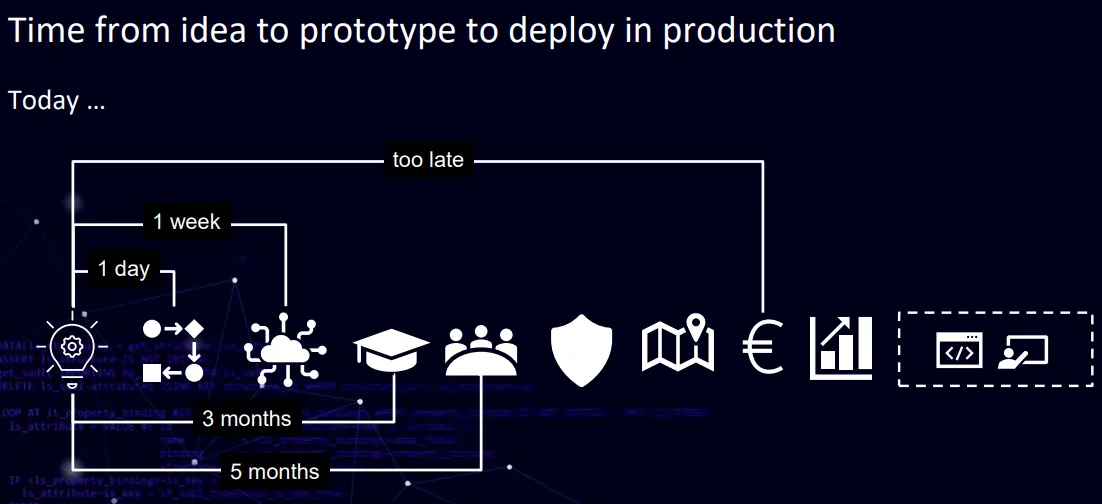 Adding to this complexity is BTP with services that are also changing constantly. This adds new challenges to every SAP project. One of the main capabilities that made SAP even with higher license, consulting, IT costs, a competitive solution was the developer capability. A common data model that was available is now distributed across several components, demanding a costly integration of all these SAP components. As a result of this change driven by SAP, the time needed to implement a solution increases. Several technologies, components, systems, landscapes are involved. More people need to be involved and with this, the time needed increases. The time needed to transform an idea to product and set it live went from weeks (if not days!) to months, or even years. Adding the probability to never go live due to higher costs and overall project execution time.