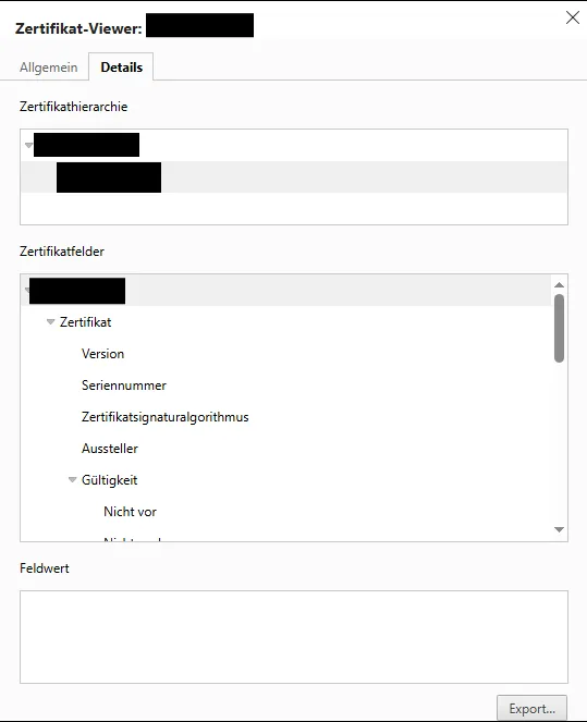 The first step is to obtain the server certificates. When opening the certificate of the server in the browser, you can see the certificate details and the CA information.