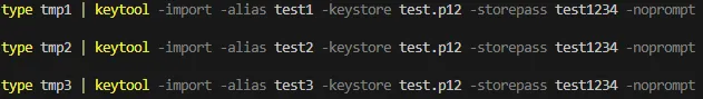 type tmp3 | keytool -import -alias test3 -keystore test.p12 -storepass test1234 -noprompt