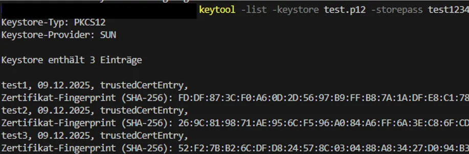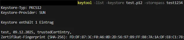 keytool -list -keystore test.p12 -storepass test1234